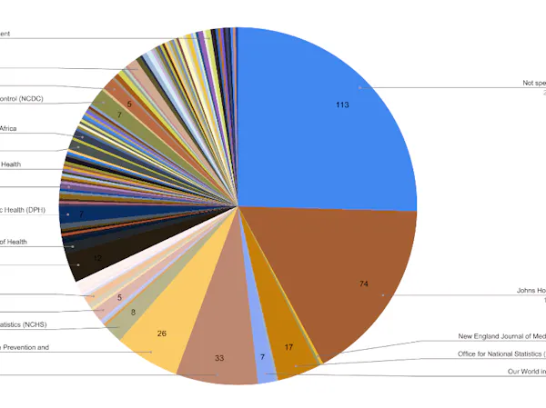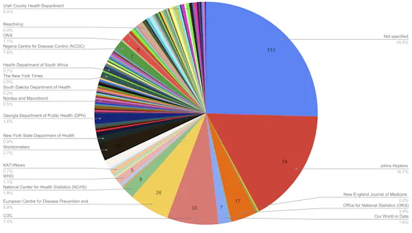 Los gráficos circulares también funcionan mal cuando hay muchas categorías. Por ejemplo, este gráfico de un estudio sobre las fuentes de datos utilizadas para la visualización de datos de COVID muestra cientos de categorías en un solo pastel.