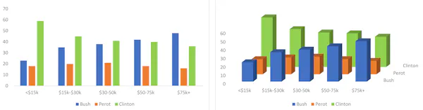 A continuación se muestra un gráfico de barras estándar y una alternativa en 3D del número de votantes en las elecciones presidenciales de EE. UU. de 1992 divididos por ingresos familiares (desde menos de 15.000 dólares hasta más de 75.000 dólares). Usando la versión 3D, ¿puedes decir el número de votantes de cada candidato en la categoría de ingresos más altos? No es fácil.